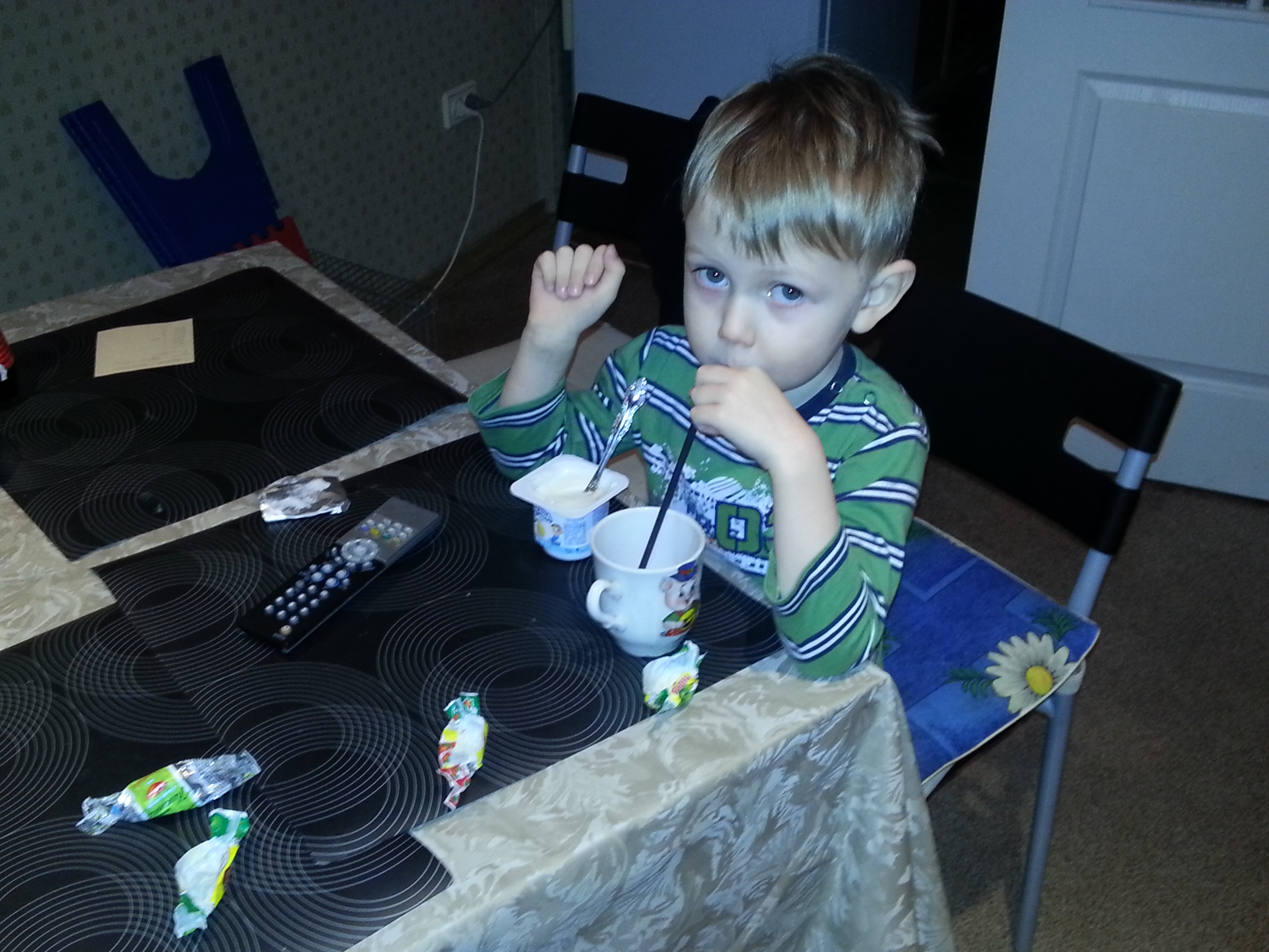 выдала творожок с компотом, подарок убрала наверх, но уже поздно:)